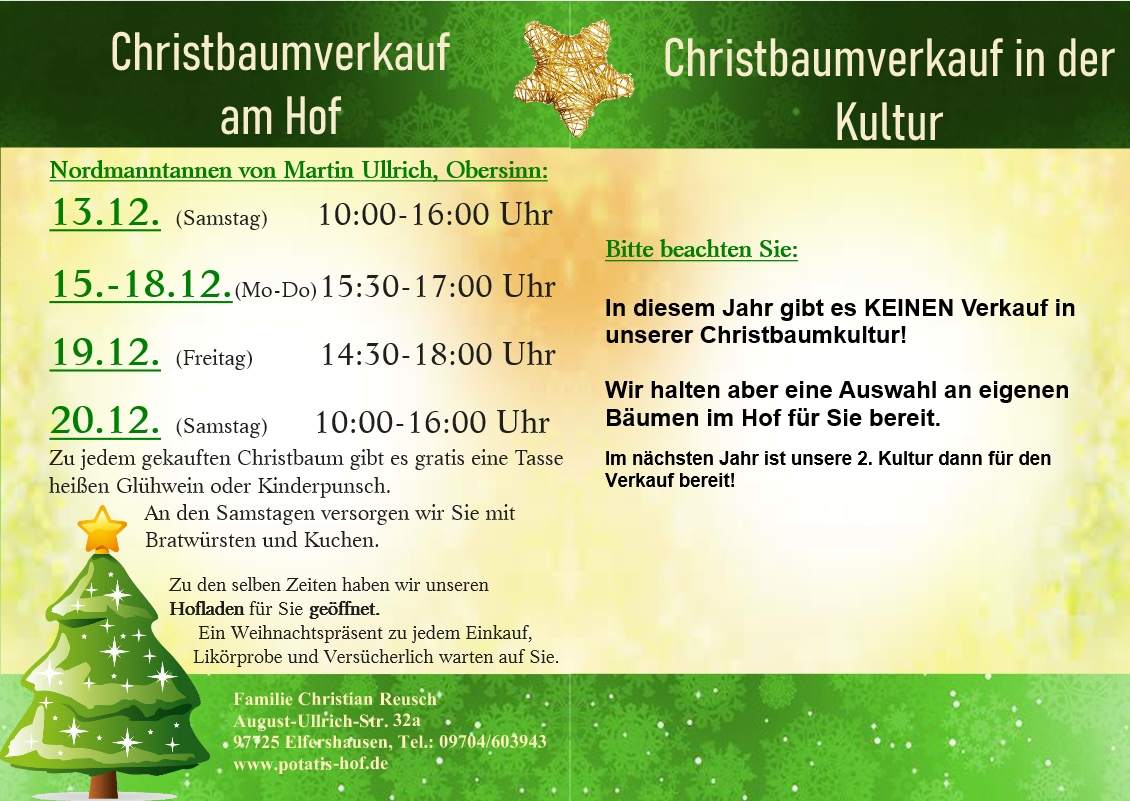 Von 13.12. – 20.12.2025 findet wieder unser Christbaumverkauf statt. Dieses Jahr nur am Hof und nicht in der Kultur. Wir halten jedoch eine Auswahl unserer eigenen Bäume im Hof bereit. Nächstes Jahr ist dann auch unsere 2. Kultur für den Verkauf bereit.